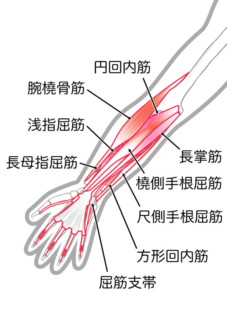 手の筋・腱膜が硬くなることで手首に痛みが出てきます。このため手から前腕を緩めることで「手首の痛み」が改善されます。